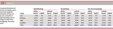 Medical students, concluding the subjects of Ophthalmology, Dermatology and Oto-rhino-laryngology during the spring semester and autumn semester of 2012 at the University of Copenhagen were assessed. Officially, the assessment method was pass/fail in the spring semester and graded (seven-point grading scale) in the autumn semester for the Danish speaking classes, whereas the seven-point grading scale was used to assess international students (English speaking classes) in both semesters owing to foreign university requirements. Approximately half of the students of the English speaking classes were Danish and the other half were from a host of European countries. Students from the English speaking classes therefore constituted the control group.