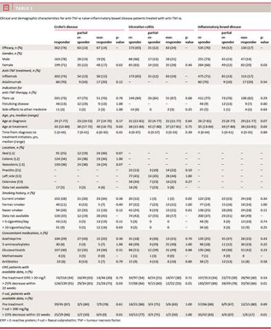 Methods: A national, clinically based cohort of previously naïve anti-TNF treated patients from 18 medical departments was established. The patients were screened for tuberculosis prior to treatment initiation. By combining the unique personal identification number of Danish citizens (the CPR number) from blood samples with data from the National Patient Registry, patients with International Classification of Diseases, Version 10 (ICD-10) codes K50-K63 were identified. Treatment efficacy reflected the maximum response within 22 weeks.