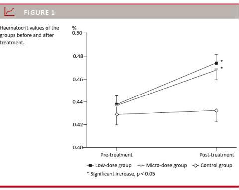 Before the treatment period started, the haematocrit (%) was 43.8 ± 0.8 for the Low-dose Group, 43.7 ± 0.7 for the Micro-dose Group and 42.9 ± 0.9 for the Control Group. The haematocrit increased significantly for the Low-dose Group and the Micro-dose Group, whereas the haematocrit for the Control Group remained the same during the treatment period (Figure 1).