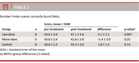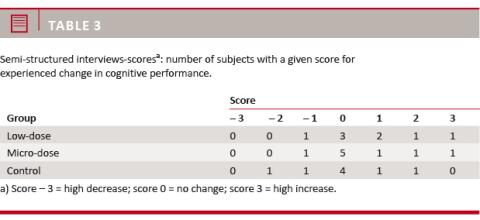 Nine subjects experienced improved cognitive performance and four subjects experienced decreased cognitive performance during the treatment period. In the Low-dose Group, 50% of the volunteers (four subjects) experienced improved cognitive performance, whereas this was the case in only 33% (three subjects) in the Micro-dose Group and 25% (two subjects) in the Control Group (Table 3).