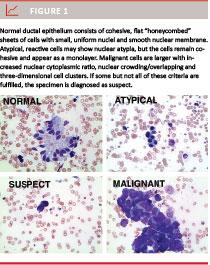 Normal ductal epithelium consists of cohesive, flat “honeycombed” sheets of ductal epithelial cells with small, uniform nuclei and a smooth nuclear membrane [1, 3-7]. Atypical, reactive cells may show nuclear atypia, but the cells remain cohesive and appear as a monolayer [1, 3, 6].