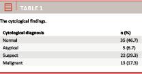 In the statistical analysis, suspicious cytology was included as positive for malignancy and atypical cytology was included as benign. This yielded a total of 46.7% (n = 35) with a malignant cytological diagnosis and 53.3% (n = 40) with a benign cytological diagnosis.