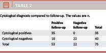 Subsequent clinical follow-up (one year) or pathological data confirmed a benign diagnosis in 22 patients and a malignant diagnosis in 53 patients. Comparing the cytological diagnosis with the final one, we found 35 true positives, 22 true negatives, no false positives and 18 false negatives. Of the five atypical specimens, four were false negatives (Table 2).