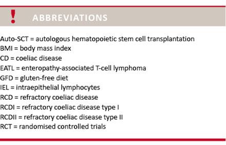 Results: Among coeliac disease patients, the cumulative incidence of RCD is 1-4% per ten-year period and the prevalence is 0.31-0.38%. In the general population, the prevalence of RCD is 0.002%. Treatment of RCDI is azathioprine (effect 100%), mesalamine (effect 60%) or tioguanine (effect 83%). Treatment for RCDII is the antimetabolite cladribine (effect 81%) and autologous haematopoetic stem cell transplantation (effect 85%).