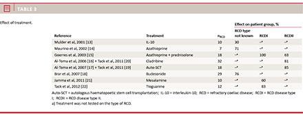 b. Azathioprine: In Maurino et al [14], azathioprine did have an effect on RCD, 71%. However, whether the effect was mainly obtained in RCDI or RCDII patients remains unknown, and it is therefore difficult to evaluate the exact effect of azathioprine. It is well documented that azathioprine in combination with prednisolone induces a partial clinical and histological remission in RCDI [6, 7, 15], thus a response to azathioprine in Maurino et al [14] might be due to undiagnosed RCDI patients.