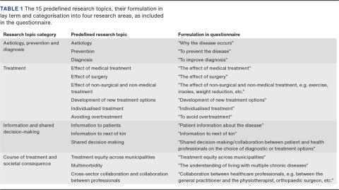 RESULTS: Out of 850 (65%) respondents, 483 had OA (mean ± standard deviation age 60.3 ± 10.2 years, 91% female). From the free-text responses, we identified seven research topics; 1) diagnostics, 2) prevention, 3) side effects, 4) treatment, 5) aetiology, 6) being young with OA and 7) quality of life. For “treatment”, we identified seven subtopics. Out of all topics and subtopics, “pain management” was the most frequently highlighted. All predefined topics were rated as “very important” or “somewhat important” by more than 75% of the respondents. The top prioritised topics within each category were 1) improving the diagnosis, 2) individualised treatment, 3) shared decision-making and 4) cross-sector collaboration and collaboration between professionals.