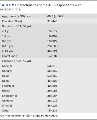 Out of the 1,315 people in the user panel, 850 (65%) responded to the questionnaire; the number of respondents with self-reported OA in any joint was 483 (57%). We excluded the remaining 43% who had other primary rheumatic diseases than OA. The affected joint was most often the knee(s), hand(s) and the spine (Table 2).