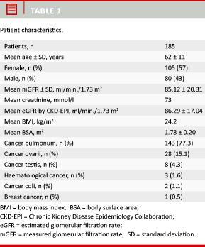 Material and methods: We investigated 185 patients with cancer who were referred for isotope measurement of GFR with 51Cr-EDTA before initiating chemotherapy treatment. The agreement between CKD-EPI and 51Cr-EDTA was assessed using a Bland-Altman plot. Test performance was analysed in a contingency table and bias, precision and the percentage of estimates within 30% of the mGFR (P30) were assessed.