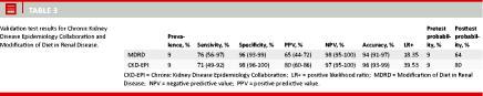 Validation of Chronic Kidney Disease Epidemiology Collaboration as a diagnostic test: Only 17 patients had an mGFR < 60 ml/min./1.73 m2, which corresponds to a prevalence of 9%.