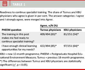 Physicians following the new 12-month programme felt less skilled and less prepared for continued specialisation than the physicians following the 18-month programme. The perceived readiness to continue further specialist training is shown in Table 1.