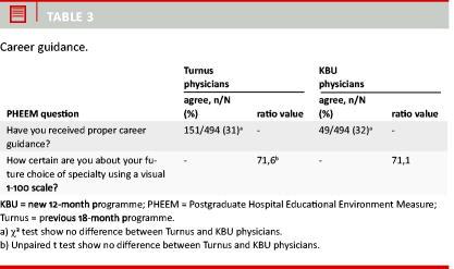When physicians were asked if they had received suitable career guidance, there was no difference between the answers of the physicians from the two programmes, although career guidance had been given higher priority under the KBU programme. Physicians choose their future speciality on the basis of other factors and independently the programme they follow. This is in accordance with the results from other studies [11, 12].