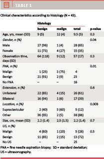 Preoperative FNA was performed in 27 cases (63%). Five (19%) FNA results suggested malignancy and 18 (67%) reactive cause. We found that the positive predictive value for benign cause was 91.3%. The positive predictive value for malignancy was 75% (p = 0.01), showing one false negative and two false positive FNAs. One of the five patients with malignant diagnoses had no preoperative FNA (Table 1). No complications after FNA were noted.