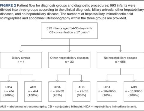 In this cross-sectional study of 14-35-day-old infants, we identified 693 individuals with a CB concentration at or above the Danish national cut-off limit of 17 μmol/l. In total, 134 HIDA scintigraphies and 151 ultrasound examinations were performed, leading to the diagnosis of four infants with BA and one infant with bile stones in the common bile duct. AUS was diagnostically informative in five infants with hydrops fetalis, liver tumours and bile stone.