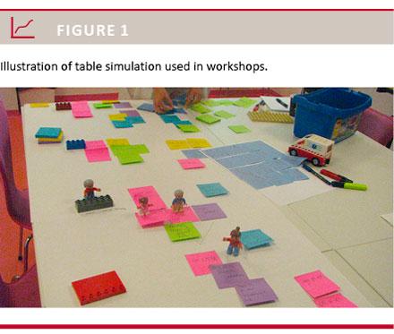 We used workshops with table simulation to map procedures related to the preparation of surgical patients and to identify challenges and solutions in the various work processes in this context. We started the workshops by presenting data from the data collection week in order to highlight and pinpoint the problems and motivate the participants to explore the underlying causes and find ideas for solutions. A floor plan of the hospital was placed on a table, and mini-mannequins represented patients and hospital staff. This set-up allowed visualisation of the patient flow and the procedures in preoperative preparation of elective and emergency surgical patients (Figure 1).