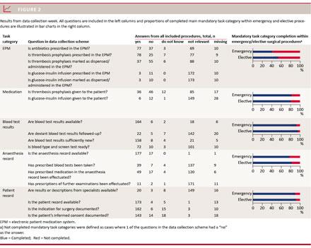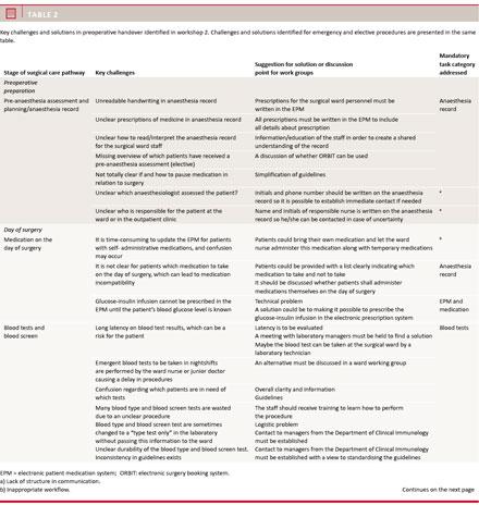 Results: In total, 314 surgical procedures were performed of which 196 were eligible for analysis. Emergency procedures showed the poorest results with non-completed tasks comprising 58% of electronic patient management system tasks, 26% of anaesthesia record tasks, 24% of medication tasks, 14% of blood test tasks and 12% of patient record tasks. In two workshops held for each of four specialties, a total of 21 participants mapped the preoperative patient journey with related responsibilities, tasks and written documentation. Furthermore, challenges and suggestions for solutions were identified.