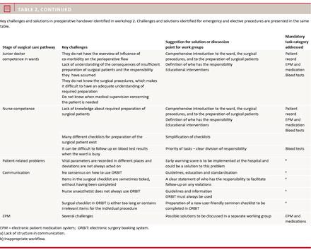 Two workshops were held for each of the four specialties (abdominal, orthopaedic, urology and gynaecology) with a total of 21 participants from surgical and anaesthesiological departments. Table 2 presents the synthesis of the workshop resumes. A description of challenges and suggestions for solutions is given for each time point in the surgical patient flow and according to the problems identified in the data collection phase. In workshop 1, the preoperative patient flow with related responsibilities, tasks and written documentation was mapped. In workshop 2, challenges and suggestions for solutions were identified within eight areas. Overall, the challenges represented organisational, technical and human aspects. Unclear understanding of tasks and responsibility and unclear communication were some of the human aspects mentioned. General solutions were: Education of staff and development of tools to facilitate a safe and structured communication including a clear understanding of work processes.