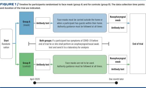 Following randomisation, participants will receive a package with all relevant equipment at their address. All participants will receive COVID-19 immunoglobulin M (IgM) and immunoglobulin G (IgG) antibody test kits (Lateral flow test, Zhuhai Livzon Diagnostics Inc., Guangdong, China), oropharyngeal/nasal swab kits (Zymo Collection Swab, Zymo Research, Irvine, CA, USA) and detailed written instructions along with a help-line phone number. Participants randomised to wearing face masks will additionally receive 50 surgical face masks with ear-loops (Type II, EN 14683, ABENA, Aabenraa, Denmark, made in CN) equivalent to a month’s usage.