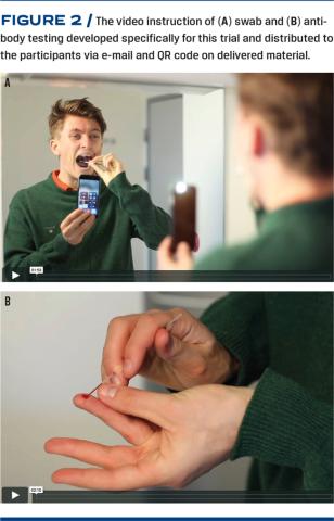 Participants will be guided by both written and video instruction (Figure 2). Video instruction material was created specifically for this trial. Antibody testing results will be collected through the survey. In addition, participants will be asked to take photos of the test in order for us to clarify if uncertainty of test results occurs. The swab tests will be sent from the participant to the laboratory shortly after the procedure. Guidance on the use of face masks are in accordance with WHO recommendations [4]. Participants in the face mask arm are instructed in consistent use of surgical face masks outside of their home.