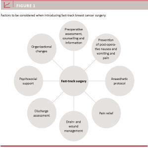 The concept of fast-track surgery or enhanced recovery programmes has been successfully introduced in many fields of surgery [1-3], including early discharge after breast cancer surgery [4-8]. However, most of the literature describes problems concerning post-operative nausea and vomiting (PONV) and pain [9]. Furthermore, drain and wound management need revision if recovery is to be enhanced. Finally, psychosocial support is an important issue, since breast cancer is a potentially life-threatening disease often followed by depressive symptoms and severe distress [10, 11]. Traditional hospitalization with a 3-5-day length of stay (LOS) offers an opportunity to provide bedside psychosocial support. In fast-track surgery, psychosocial support must, how-ever, be provided by an outpatient department to cover the need for patient education and counselling, reinforce self-care and provide emotional support. Hence, introducing fast-track surgery involves changes in daily routines and requires a multidisciplinary effort and a firm implementation strategy including thorough consideration of several factors (Figure 1).