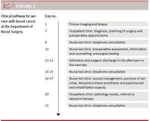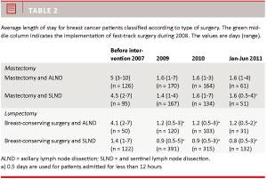 Results: The overall mean length of stay (LOS) decreased from 3.6 days before introduction of fast-track surgery to 1.2 days after its implementation. The largest decrease was observed among patients undergoing mastectomy, where LOS was reduced from 5.0 to 1.6 days. The number of beds at the department was reduced by about 30% and a nurse-led clinic was established which enabled nurses to take charge of wound management, seromas, temporary breast prostheses and psychosocial and rehabilitation aspects in the outpatient clinic. Additionally, the previously available telephone counselling service was intensified to provide immediate advice and support.