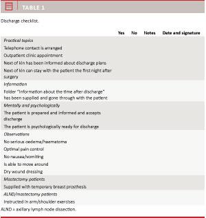 Every patient was assessed according to clear guidelines before discharge, consisting of practical, physical and psychological aspects of importance for early discharge. The assessment was documented on a check list (Table 1). Information about wound management, post-operative pain management and psychological aspects was given orally and in writing before discharge. Relevant rehabilitation activities were planned. The patient was given a name and telephone number to “her” contact nurse and had as a minimum one planned telephone contact 2-3 days after discharge as well as a planned visit to the outpatient clinic after 5-6 days.