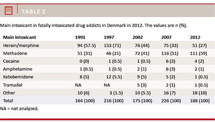 Results: A total of 188 fatal intoxications were recorded. The median age increased from 37.5 in 2007 to 41.5 in 2012. The majority were men (77%). Methadone (59%) was the main intoxicant. The decrease in the frequency of heroin/morphine deaths since 1997 (71%) continued, declining to 44% in 2002, 33% in 2007 and finally to 27% in 2012. Few deaths from central stimulants (amphetamine and cocaine) occurred. Multiple drug use was common and consisted mainly of opioids, cocaine, amphetamine, cannabis, benzodiazepines and alcohol. Heroin/morphine use was most frequent on Funen and in South Jutland. Cocaine was most frequently detected in East Denmark, while amphetamine was more frequent in West Denmark.