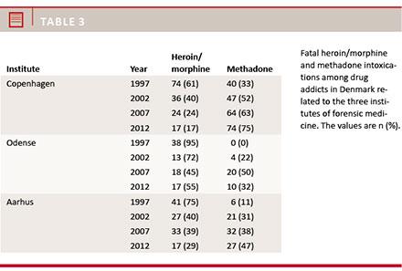 This study included all fatal poisonings among drug addicts examined at the three institutes of forensic medicine in Denmark: Copenhagen (Zealand, surrounding