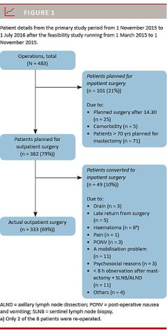 Setting: The study was performed in a specialised department for breast cancer surgery with more than 900 annual surgical procedures. All operations from 1 March 2015 to 1 July 2016 were included, but plans for an outpatient setup were initiated as from 1 November 2015.