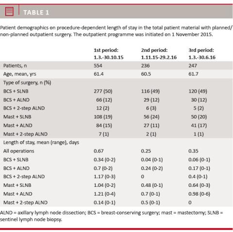 Results: Of the 382 patients who were planned for outpatient surgery (79%), 90% received surgery in an outpatient setup. Among the 101 patients (21%) who were planned for inpatient surgery, 17% returned home on the day of surgery. Consequently, the overall outpatient rate was 72% and the overall mean length of stay was 0.3 days, ranging from 0.1 days for breast-conserving surgery to 0.8 days for mastectomy. About 2% were readmitted within < 30 days, mostly due to wound problems.
