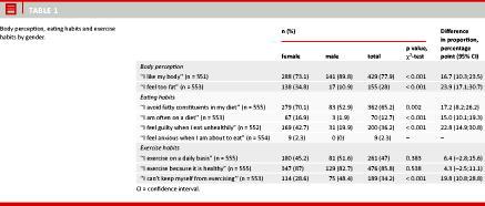 Results: More males (89.8%) than females (73.1%) were satisfied with their body and more females (34.8%) than males (10.9%) felt too fat. More females (42.7%) than males (19.9%) felt guilty when eating unhealthy food. 2.3% (all females) claimed to feel anxiety when they were about to eat. More males (48.4%) than females (28.6%) stated that they could not keep themselves from exercising. 13.5% of the underweight females (body mass index < 20 kg/m2) felt too fat, while none of the underweight males had this perception. In average, females and males displayed 2.8 and 2.1 risk behaviours, respectively.