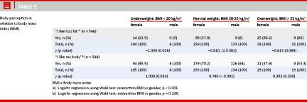 The statistical analyses were conducted in SPSS 15.0. Correlations were tested with χ2-test, trends were tested with γ-test, and differences in means were tested with Student’s t-test. Logistic regression was used to assess the effect modification of BMI and gender on body perception. All tests were assessed at a 5% significance level.