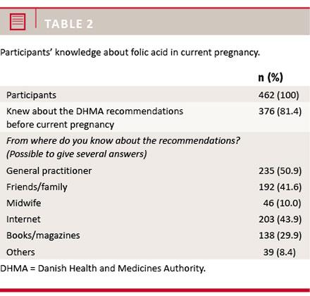 Results: A total of 462 women answered the questionnaire. 95% had taken FA supplements at some point during their pregnancy, but only 10.4% as recommended. More than 80% stated knowledge about recommendations before the current pregnancy. Positive predictors of knowledge were: age > 30 years, multiparity, Danish origin and education > 3 years.