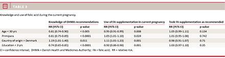 The probability that a woman had knowledge of recommendations in relation to age, parity, country of origin and educational level was tested by use of 2 × 2 tables calculating the relative risk (RR). The same was done for use of FA in current pregnancy and use of FA as recommended by the DHMA. p-values < 0.05 were regarded significant.