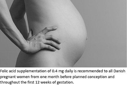 Since 1997, the Danish Health and Medicines Authority (DHMA) has recommended that Danish women take 0.4 mg of FA supplemantation daily, starting at least one month before planned conception and continuing throughout the first 12 weeks of pregnancy as a means of primary prevention of NTD. Women at high risk of NTD (women/husband has NTD, previous pregnancy with NTD, women with epilepsy) are recommended a daily dose of 5 mg. The DHMA and the Ministry of Food, Agriculture and Fisheries of Denmark have established a series of health promotion campaigns in agreement with national recommendations.