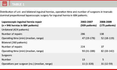 This was a retrospective, single-institution study with inclusion of consecutive patients during the eight-year period from 2002 to 2009. Data were collected for the entire study and analyzed for the two periods. The first period, from 1 January 2002 to 31 December 2007, included patients operated prior to a reorganization of the department‘s laparoscopic inguinal hernia surgery, and the second period, from 1 January 2008 to 31 December 2009, comprised patients operated after the reorganization.