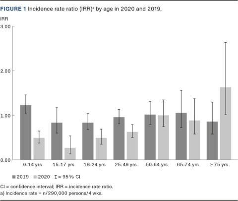 METHODS. We analysed the incident rate ratio (IRR) between the first month of the lockdown with the IRR recorded in the month leading up to the lockdown. We then compared this IRR with the IRR for the equivalent periods of 2019. The outcomes were: diagnoses (or diagnosis groups), activity during injury (ADI), mechanisms of injury, age group and gender. Secondarily, certain specific diagnoses (or diagnosis groups) were analysed by ADI and mechanism of injury.