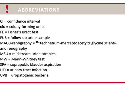 Hvidovre Hospital. A significant urine culture was growth of at least 1,000 colony-forming units per ml (cfu/ml) of UPB in monoculture from a suprapubic bladder aspiration (SPA), or at least 10,000 cfu/ml of UPB in monoculture from 2 MSU taken within 24 hours.