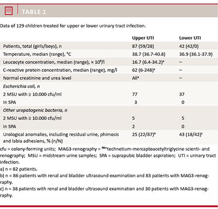 We included 129 patients: 87 patients treated for upper UTI and 42 treated for lower UTI, Table 1. The median age of the patients treated for upper UTI was 1.1 years (range: 0.1-15.6 years). In 82 cases, it was their first