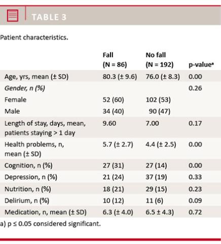 Patients who had experienced a fall prior to the current admission had a mean of 5.7 health problems compared with patients without who had a mean of 4.4 (p = 0.00), they were significantly older than patients with no falls, and they had a longer lengths of stay. However, we did not find more falls among females than among males, Table 3.