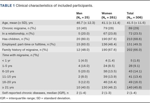 In the inclusion period (September 2017 to February 2018), a total 11,266 completed the My Migraine Voice Survey, 306 of whom were Danish respondents. Per protocol, all participants had a minimum of four MMDs, with a median of eight days (IQR: 5.9-11.7 days). The median number of headache days per months was 11.3 (IQR: 8-17.8) and a total of 89 (29%) participants met the ICHD-3 criteria for chronic migraine. The mean severity of pain during migraine attacks in the preceding month (0-10 verbal rating scale) was 7.3 (SD: ± 1.3). Most patients, 213 (70%), had taken PT (past or present) for their migraines; and among these, 170 (80%) had experienced at least one treatment failure. The mean age of participants was 41.5 (SD: ± 11.6), with a 6+ year history of migraine 273 (89%). The characteristics of study participants are listed in Table 1.