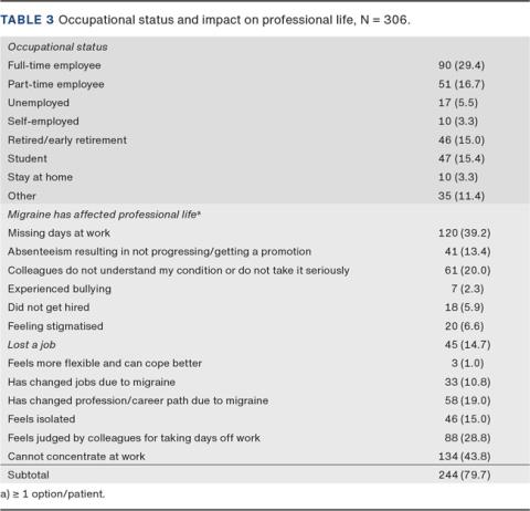 RESULTS The median number of headache days per months was 11.3 (8-17.8) and 89 (29%) of patients met the criteria for chronic migraine. Most patients (n = 213; 70%) had taken preventive treatment (PT) for their migraines and among these 170 (80%) had experienced at least one treatment failure. Ninety-four (44.1%) patients reported being dissatisfied or mostly dissatisfied with their PTs. A negative impact of migraine on either private, social or professional life was reported by 303 (99.0%) patients; and among these, 195 (64.4%) reported an impact in all three domains.
