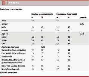 We included 109 patients, 55 from the ED and 54 from the SAU. There was no statistically significant difference between the two groups with regard to age, sex and diagnosis (Table 1).