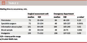 Results: The study included 109 patients. In the SAU, the median waiting time to be seen by a doctor was 72 min. and in the ED it was 86 min. (p = 0.25). The median time to be seen by a surgeon was 72 min. in the SAU and 148 min. in the ED (p ≤ 0.0001). In the SAU, the median time to a treatment plan was 131 min. and in the ED 166 min. (p = 0.02). In the SAU, patients spent 15 min. with nurses, in the ED 32 min. (p ≤ 0.0001). In the SAU, patients spent 11 min. with doctors in the ED 24 min. (p ≤ 0.0001).