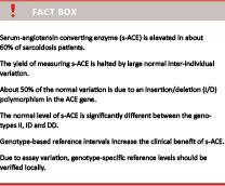 Sarcoidosis is an inflammatory, granulomatous disease. Its pathogenesis is unknown, but probably involves genetic predisposition as well as external factors [1]. Approximately 500 new cases are diagnosed in Denmark annually. Diagnosing sarcoidosis is challenging and includes radiological changes, clinical manifestations and paraclinical findings, including measurement of serum angiotensin-converting enzyme activity (s-ACE, peptidylpeptidase A). ACE has a number of metabolic effects; most notably it catalyses the modification of angiotensin I to angiotensin II, a potent vasoconstrictor [2] and inactivates bradykinin through the kallikrein-kininogen system [3]. It is also a potent pro-inflammatory modulator [4] secreted by activated cells of the monocyte-macrophage cell lineages, which are crucial in the process of granuloma formation. S-ACE is elevated in about 60% of sarcoidosis patients [5], but also in other granulomatous diseases like Gaucher’s disease and tuberculosis [6]. Though the level of s-ACE reflects the mass of granuloma in the body [7], the clinical use of s-ACE in monitoring disease activity is controversial, and recommendations differ between guidelines.