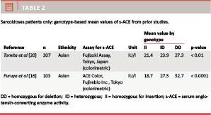As shown in Table 2, a significant difference in s-ACE between genotypes was also present among a smaller number of verified sarcoidosis cases. It has been demonstrated that the genotype DD is associated with a higher increase in s-ACE than the genotype II [22] in sarcoidosis. The data included in this review did not confirm this trend as the DD/II ratio of s-ACE was lower in sarcoidosis populations than in healthy study populations. However, this assumption is based on two studies only, and it only represents Asian patients. In neither of the two studies were the genotype-based ACE levels stratified for severity of sarcoidosis; therefore, they did not reveal whether the impact of the I/D genotype on s-ACE reflects sarcoidosis severity.