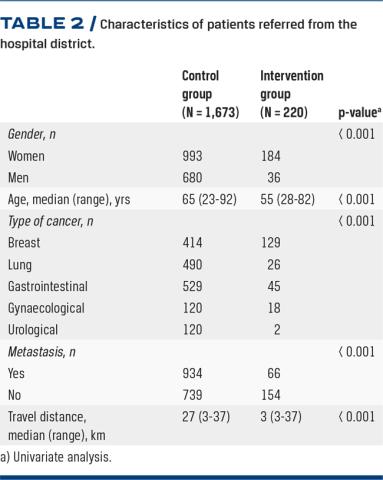 From January 2014 to June 2017, a total of 1,893 patients from the hospital district were referred to the Department of Oncology. Among these, 220 patients participated in the exercise programme (52 were from other hospital districts), leaving a control group of 1,673 patients. Characteristics of the control and intervention groups are shown in Table 2.