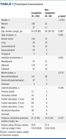 The two groups were, to some extent, quite similar (Table 1). The median travel distance was 21 km (range: 3-99 km) and 19 km (range: 3-56 km) for the completing and non-completing group, respectively, (p = 0.37). The percentage of men was higher in the non-completing than in the completing group, 44% and 16%, respectively, (p < 0.001). Type of cancer and intention of treatment were also significant in relation to completion (p < 0.001). Patients with gastrointestinal cancer and those in palliative care had the lowest completion rate. Marital status, age and education had no significant impact on completion (p = 0.57, p = 0.887, p = 0.19, respectively), nor did fitness rating at start-up (p = 0.65). A multivariate regression analysis on gender, age and type of cancer showed that gender remained highly significant (p< 0.001), whereas type of cancer and distance were no longer significantly related to completion (p = 0.06 and p = 0.15). In the multivariate analysis, age was a significant factor (p = 0.043).