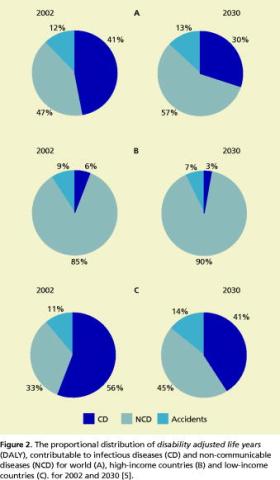 Of the estimated 1.5 billion DALY's that comprise the overall global burden of disease, CDs, NCDs and accidents contribute to 41%, 47% and 12%, respectively [3]. Globally 79% of all deaths which are caused by NCDs take place in low-income communities. In this context it is relevant to notice that out of a global population of six billion individuals, 80% live in low-income countries. There is a pronounced variation in the proportional distribution of CDs and NCDs when comparing geographical regions ( Figure 1 ) [2]. It appears the obvious trend is an increasing proportion of disease burden which can be related to NCD with increasing level of economic development and modernization. As a result of the epidemiological transition, these pronounced differences between geographical regions will tend to diminish in the coming decades.
