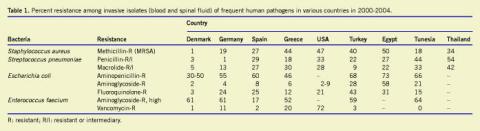 Table 1 shows the frequency of resistance for selected antibiotics and important human pathogens in different parts of the World including countries which are often visited by Danish tourists. Thus, Denmark and Germany generally report low frequencies of resistance excepting ampicillin resistance in Escherichia coli and gentamicin high level resistance in enterococci. In addition, endemics and epidemics with multi-resistant bacteria are becoming increasingly common both in- and outside hospitals.