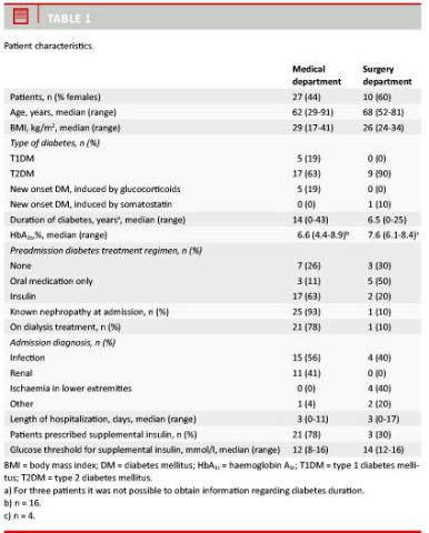 Material and methods: Patients were prospectively identified at 11 consecutive Wednesdays in one medical and one surgery department and information from the previous three days of admission was collected, including: bedside p-glucose readings, scheduled and supplemental insulin treatment.